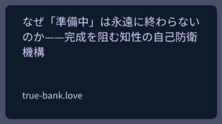 なぜ「準備中」は永遠に終わらないのか——完成を阻む知性の自己防衛機構 準備という名の逃避——知性が生む最も精巧な罠準備と勤勉を等号で結ぶ前提を疑わないこと自体が思考の粗さの自白であるが、この誤認が単純な認識誤差に留まらない理由は、知性そのものの自己防衛機構として産出される構造物であり、その精巧さゆえに製造者本... 2026.03.21 哲学